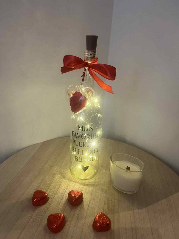 Sfeervolle en liefdevolle decoratieve glazen fles met warme LED-lampjes op batterij.