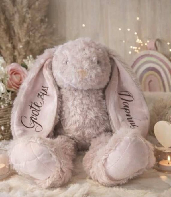 De lange oren worden gepersonaliseerd met een naam of korte tekst naar keuze wat de knuffel uniek en blijvend maakt.
