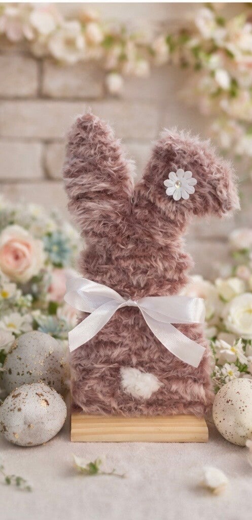 Ze zijn afgewerkt met zachte stof, een lief strikje en een klein staartje, en staan op een houten voetje.